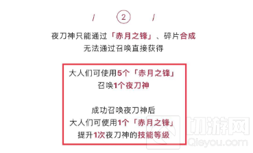 夜刀神赤月之锋,获得5个后可以在召唤界面进行召唤,召唤后多余的赤月之锋,可以用一个赤月之锋给夜刀神的技能升级一次。