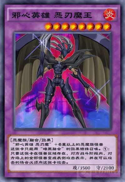 使用「邪心英雄恶刃魔」暗黑融合而来的强大恶魔,霸王十代的王牌怪兽!此卡会令对方的怪兽在战斗阶段内全部变为攻击表示,且在可以攻击的场合必须向此卡发起进攻!