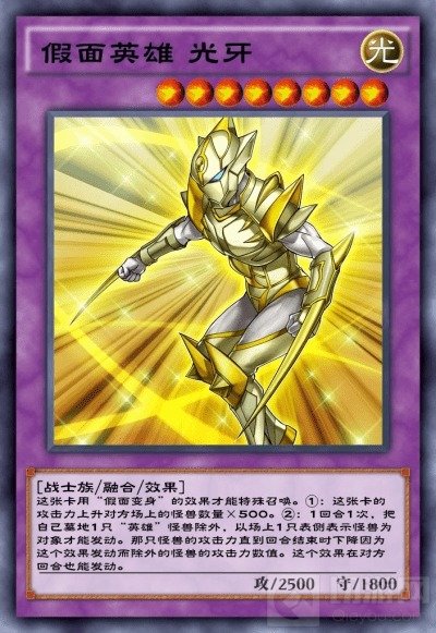 此卡的攻击力可以根据对方场上的怪兽数量而提升!可以通过将自己墓地1只「英雄」怪兽除外,令场上1只怪兽的攻击力下降除外怪兽攻击力的数值。光属性「假面英雄」强势登场,为「假面变身」提供更多可能!