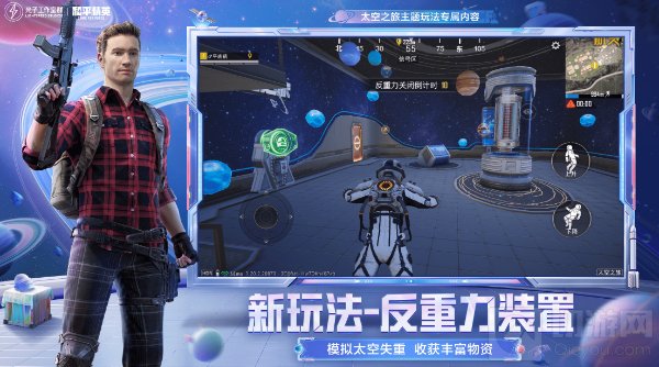 《和平精英》“太空之旅”版本还推出众多太空专属玩法。其中,在全新“创乐太空馆”,特种兵可以了解航天科普知识,感受还原太空环境的“反重力装置”——激活装置后,会从天花板向四周发射悬浮空中的高级物资及彩色水球,玩家将进入失重状态,漂浮空中并拾取悬浮物资,若触碰彩色水球,玩家将在空中停滞2秒,失重过程持续30秒。