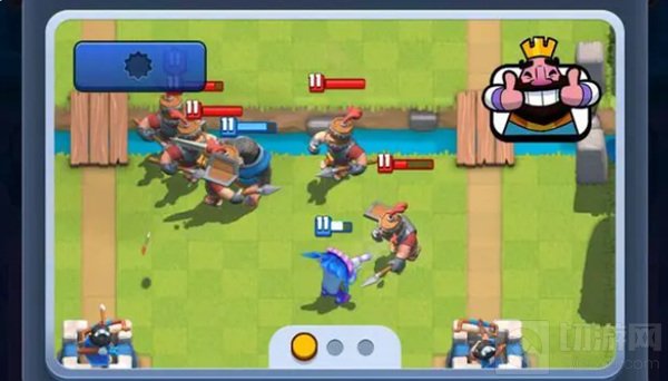 吹箭哥布林防守完对面的残血部队后,桥头可以直接下骷髅气球,为吹箭哥布林抗伤害,从而打出巨额伤害。