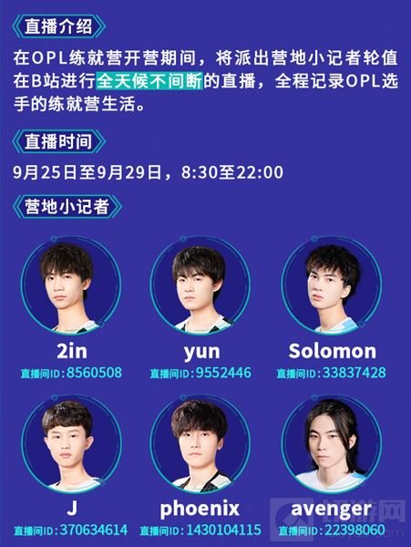 9月25日-9月29日之间,每天的早上8:30-晚上22:00,OPL练就营将全天候不间断为观众们直播选手们的所有动向,全程记录他们的练就营生活。与以往不同的是,这一次负责直播的是六位营地小记者,他们分别是来自OMG的顶流老大哥兼社交牛x症的2in,以及其队友OPL第一自律型选手yun,还有来自BLG.M的人气主播兼气氛组选手solomon,ASTER的话唠上单J、ESG颜值与解说担当的Phoenix。同时,CC直播也派出了营地小记者COLD、daodao、ACHEN、soar带领大家走近练就营。
