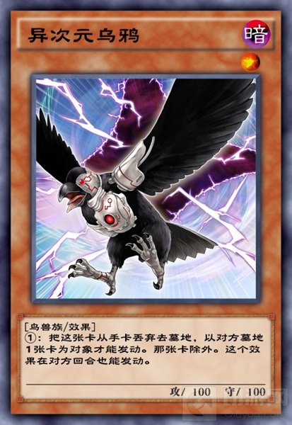 游戏王早期环境中最有名的手坑卡牌之一,属于异次元系列的本家卡牌。异次元乌鸦早期并没有非常亮眼的表现,直到部分墓地资源运转为主的卡组出现,大家才发现异次元乌鸦的妙用。不过当时大宇宙以及次元裂缝等卡牌太过亮眼,所以变相压缩了异次元乌鸦的生存环境。直到铁兽、ll等适配鸟兽族的卡组出现之后异次元乌鸦才再度崛起,成为了版本泛用side手坑之一。
