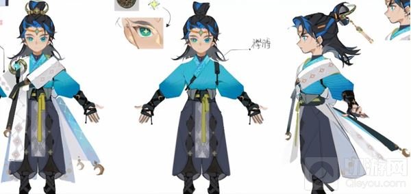 有别于在剧情中出现的形象,新主角越星河拥有异色的瞳孔和挑染的头发,这都象征着他具有不同寻常的过往,也体现了其不拘一格的性格特点。在服装风格上,他身着象征星空的蓝色鹤氅以及黑色襻膊,这样的着装风格隐喻着越星河并非刻板印象中的领袖形象,他越热爱生活,并且充满个性。