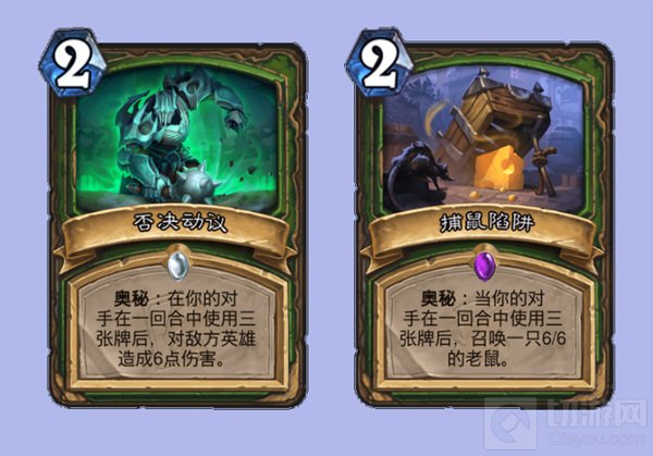 猎人又增加了一张奥秘,这个奥秘的效果有点像当年的”捕鼠陷阱”,区别在于一个是站场,一个是直接把伤害打到脸上,这两个奥秘各有各的好处,谁强谁弱一时也不好说,不过对于快攻打脸形态的猎人来说,可能六点伤害实实在在打到对手脸上要更好一些,而且2费打6确实是有点恐怖了,只要在环境里有的时候就需要防一手。顺带一提,猎人英雄牌发现的强化版本是打9,这波是英雄牌得到了加强……