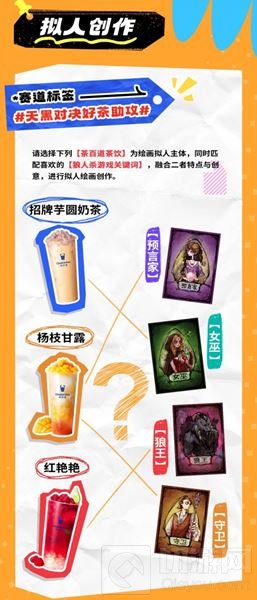玩家们需要以指定茶百道茶饮为本次绘画拟人主体,并结合自己喜欢的狼人杀关键词,将二者进行融合创作。美味的杨枝甘露与预言家之间能碰撞出怎样的火花呢?快来发挥你的无限创意,创作出独一无二的狼人杀风格拟人茶饮吧!