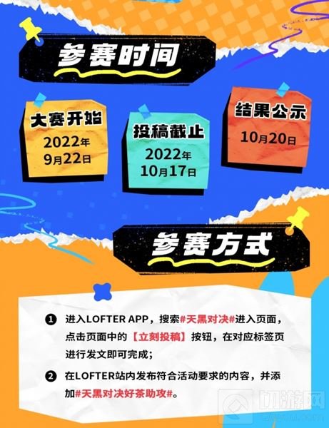 本次活动开启时间为2022年9月22日,投稿截止日期为2022年10月17日,玩家们可进入LOFTER,搜索“天黑对决”进入活动界面,点击“立刻投稿”,发布符合活动要求的内容即可参与成功。