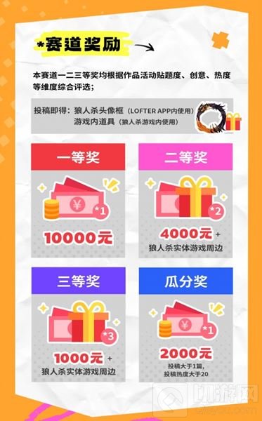 本次活动参与投稿即可获得LOFTER狼人杀专属头像框及狼人杀游戏礼包,同时官方将结合作品的贴合度、作品创意、综合热度等进行多维度评选,获得一等奖的作者将斩获万元现金大奖,二、三名作者可获得千元现金奖励及狼人杀周边福利,投稿大于1篇且热度超过20的作者也能参与奖励瓜分,快来一展身手吧!