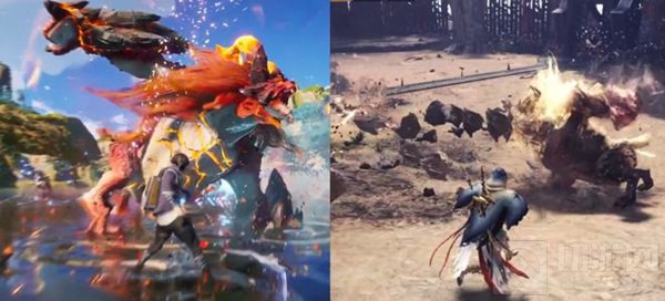 王者荣耀世界的实机演示,给我印象最深刻的并不是画面有多好,故事有多吸引人,而是它的战斗模式一下子让我想起了另一款一个模子里刻出来的游戏——卡普空在2018年推出的《怪物猎人:世界》。就连名字,二者都是如此的相像,更不要说演示片中这个神似怪物猎人「金狮子」的怪物,无论是造型、动作都生怕人认不出来一样。