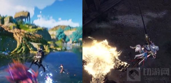 而最为标志性的「借鉴」,则是主角在战斗中使出的一击跳跃劈砍攻击,像极了怪物猎人中太刀武器的招牌技能「气刃兜割」,老玩家称其为「登龙剑」。两者的动作都是先向前突刺,命中后转为高跳,再向下劈砍拉出刀光。