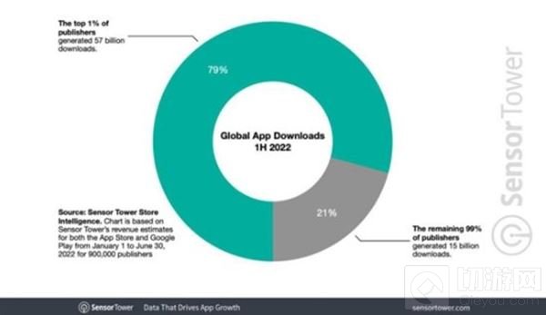 根据分析结果,有1%的开发商共计获得了79%(720亿次)的下载安装,其他99%的开发商则在竞争剩下21%的市场。