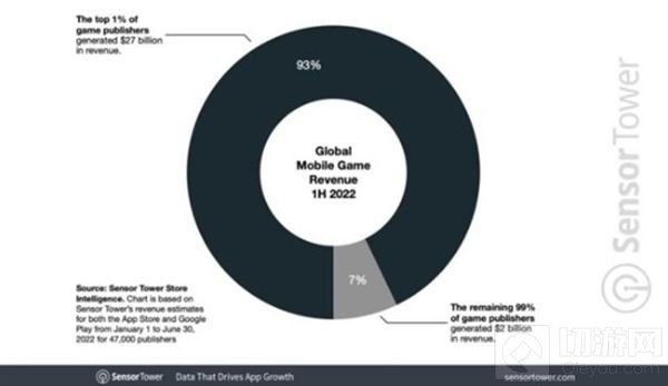 移动游戏方面,前1%的厂商拿到了全球93%的收入,剩下99%的厂商则只有7%左右的市场份额