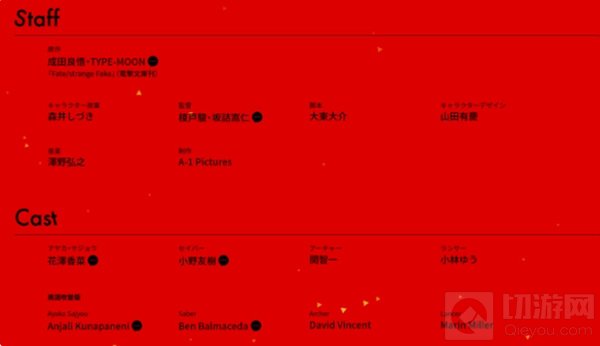 声优目前只公开了4位,分别是沙条绫香的声优花泽香菜、Saber(理查)的声优小野友树、Archer(金闪闪)的声优关智一,以及Lancer(恩奇都)的声优小林优。
