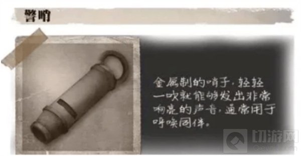 3、警哨——用金属制作的哨子,只要稍微一吹就能发出非常响亮的声音,这个是双监管者模式中求生者可以兑换的一个专属道具,使用的方法就是可以让队友快速地找到自己的位置,在地图中是有箭头提示的,这个道具主要是受伤的求生者需要队友帮助时候会经常使用,但是使用的次数是有限制的!