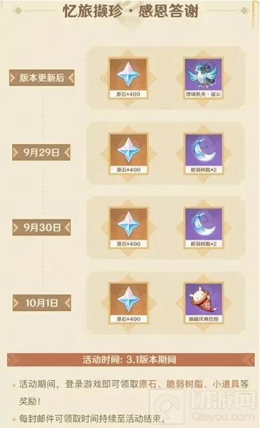 与此同时,周年庆活动奖励也已经公布,分为两个板块,首先就是更新之后持续到十月初,每天都能获得特殊道具、树脂以及固定的400原石,全部拿到的话至多1600原石等于十抽。