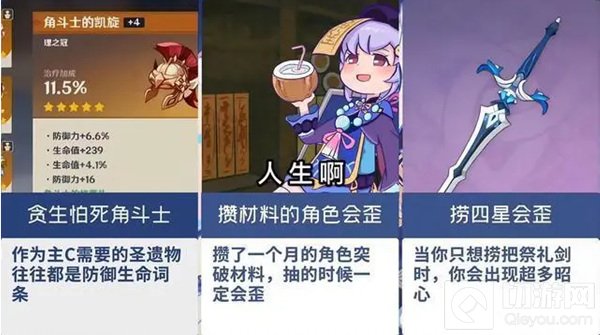 那些输出型圣遗物,刷取和强化出来的,主词条和副词条不是防御力就是生命值,而反观少女套这类辅助型圣遗物,双爆和大攻击多的挡都挡不住。所以才有了这句调侃,贪生怕死角斗士,勇往直前少女心,真实的让人泪目。