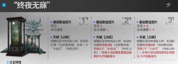 升级专属效果:强化的是点睛天赋,也就是部署后首次攻击敌人,在目标位置召唤一个25秒的小自在,升级后范围扩大到周围四格,同时变成2个小自在,且追加了额外的效果就是所有小自在的属性更强,且每秒为夕回复技力。