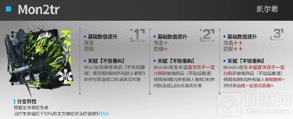 专属效果:强化的是M3大哥被击倒后的天赋,之前是被击败后,周围8格敌人晕眩3秒+1200真伤,现在强化了,只要是首次血量低于一定比例就会触发这个效果,同时晕眩和真实伤害也有所加强。