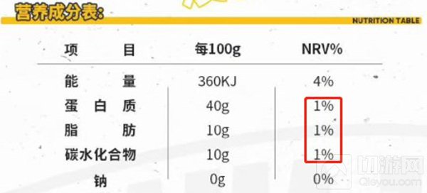 明日方舟饼干的能量为360KJ,NRV应该为4%,蛋白质含量40g,NRV应该为67%,脂肪10g,NRV应该为17%,碳水化合物10g,NRV应该为3%。