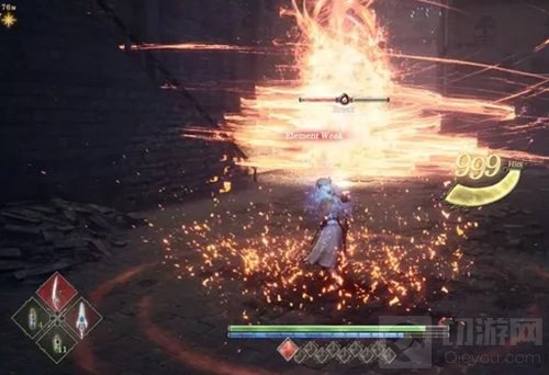 属性攻击的手段大致分为两种。其中一种是需要消耗战技槽发动的「神圣战技」。游戏中存在各种不同属性的神圣战技,如雷属性的「雷霆闪电」、炎属性的「爆炎风暴」等等。玩家最多可设置 4 个快捷发动的战技,使用起来相当便利。