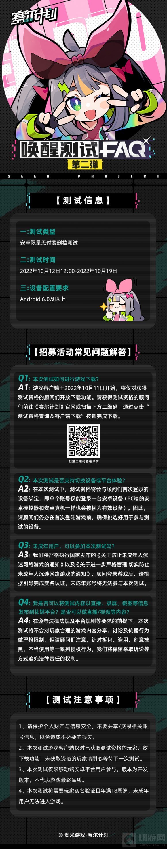 本次「唤醒测试」的测试类型为安卓限量删档不计费测试,测试时间定档为2022年10月12日-2022年10月19日。在2022年9月15日-2022年10月7日期间,完成招募活动问卷填写的玩家,现在可前往《赛尔计划》官网,查询是否获得本次测试资格。《赛尔计划》官方也会以短信的形式通知成功获取资格的用户,请玩家们留意官方消息。游戏预下载功能将于10月11日开启,获得测试资格的用户可自行前往下载。