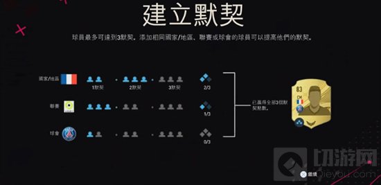 球队一上手就会发现阵容中原本代表各个球员之间默契程度的红绿线不复存在,取而代之的是一种点数系统。主力阵容 11 人,每个人最多有 3 点加成,根据同国籍、同联赛、同队伍三种维度进行加成,理想情况下全队达到 33 点即可。