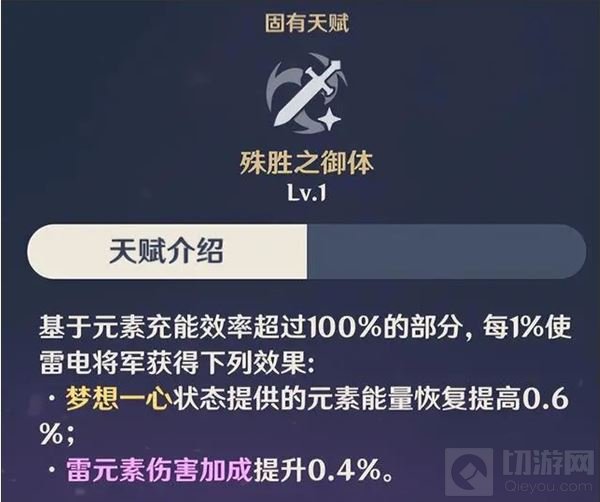 同时对于雷电将军也是一样的,作为将军的天赋技能,该技能可以基于雷迪将军充能效率超过100%时,每1%可以提供0.6的元素能量。