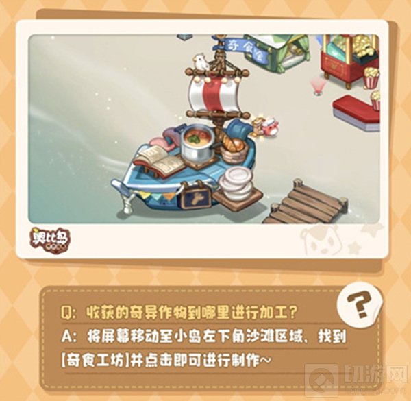 答:将屏幕移动至小岛左下角沙滩区域,找到【奇食工坊】并点击即可进行制作;