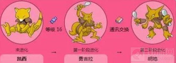 凯西16级进化。宝可梦大探险游戏中,凯西16级进化为勇基拉,勇基拉36级进化为胡地。