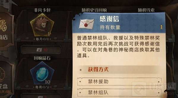 游戏中,大家可以通过禁林援助,禁林组队的方法获取来【感谢信】道具,每天最多是可以获得10张感谢信。感谢信可以兑换的道具还是很不错的,大家平时有时间可以多刷一刷,把每天的这10张感谢信给拿满。