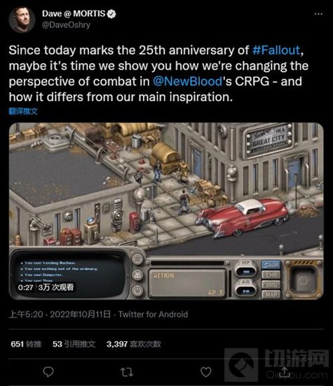 Oshry 说道:“考虑到今天是《辐射》的 25 周年纪念,也许是时候向你们展示我们如何改变 New Blood 的 CRPG 中的战斗时叫,以及它与我们主要的灵感来源(《辐射》)有何不同。”在同条推特中,他发布了一段简短的游戏实机视频。