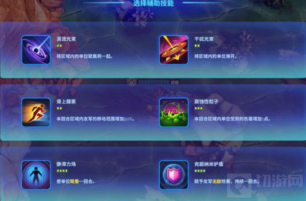 好了,你现在组建了完善的卡组进入了对战,但是别急,这时候你需要在三组技能中选择一组技能作为你这句对战的辅助技能,每位指挥官刷新出的都是6个技能,两两一组合计三组,这些技能是玩家能对战局进行直接影响的技能,涵盖了支援、输出、治疗、控制等方向。