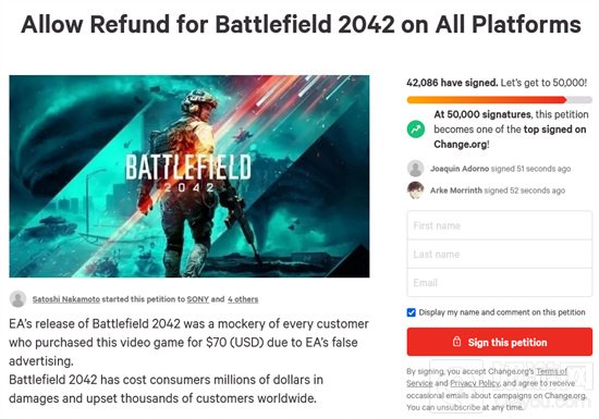 尽管今年已经报道过很多《战地2042》的相关信息,但是最近一则消息一出,真的很难让人蚌的住,最近请愿网站change.org上线了一个关于《战地2042》的退款请愿,这一点还不是最厉害的,厉害的一点是,该请愿书如果有超过5万的签名,将会有美国最好的集体诉讼律师之一接受这起案件,也就是说玩家们真的有可能会退款成功,目前在这份请愿书上已经有了4万2千份的签字了,看来这波是势在必得了。