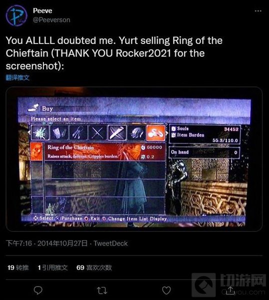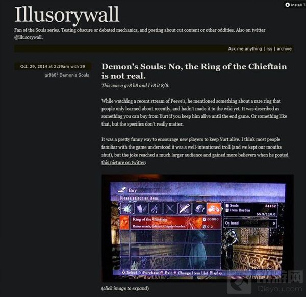 一篇在 Tumblr 上于2014年由用户 Illusorywall 发布的贴子就该物品进行了深入的讨论,其中就包括推特用户 Peeve 的一张“截图”。图片中,在原版游戏中完全不存在的戒指是由游戏中角色 Yurt the Silent Chief 售卖的。