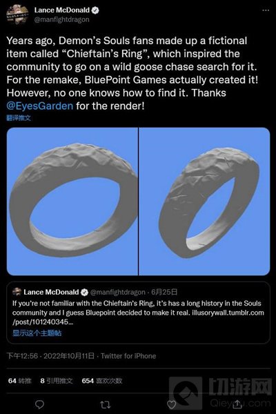 这个戒指的英文文件名叫“Chieftain’s Ring”,和此前《恶魔之魂》粉丝社区中盛传的一个虚构的物品“Ring of the Chieftain”非常类似。这个物品此前一直是《恶魔之魂》玩家中的“都市传说”,也经常被用来“钓鱼”骗人。