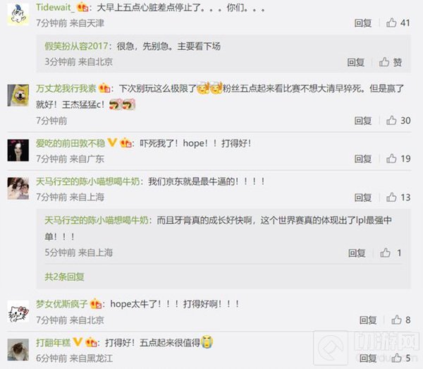 除了比赛的内容之外,还发生了一件非常有意思的事情,由于这场比赛的开始时间是在凌晨的5点多,所以非常多网友早早定好了闹钟,准点起床看比赛。结果JDG在大优势的情况下,一波团战把自己给玩成了大劣势,让非常多凌晨起床看比赛的网友心都悬了起来,好在最终还是有惊无险赢了下来,所以JDG的官博现在也是彻底沦陷。