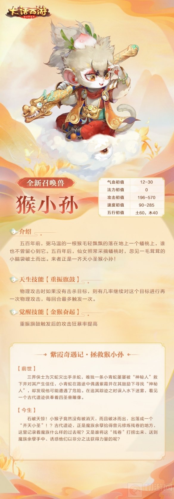 全新召唤兽猴小孙自带天生技能【重振旗鼓】,在猴小孙发动物理攻击时,如果没有击败目标,则有几率继续对这个目标进行再次攻击,每回合最多触发一次;当触发觉醒技能【金猴奋起】后,【重振旗鼓】出发后的攻击狂暴率也将提高。此外,今日猴小孙的初始数值也正式公开,一起来看看吧!