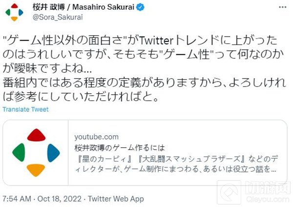 ·樱井政博表示,“游戏性之外的乐趣”的话题引发网友关注,登上推特锐推趋势,实感欣慰之余,还是得承认“游戏性”到底指什么这个问题难以界定。