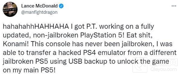 Lance McDonald表示他使用了USB备份功能,让《P.T.》在未越狱的PS5主机上运行。首先你需要一个带有《P.T.》的账户,然后在越狱的PS5上登录该账户,之后使用USB备份功能,备份游戏后将USB连接到未越狱的PS5上,从而安装《P.T.》。但这有一定风险,可能会导致你的PSN账户被封禁,所以谨慎些吧。
