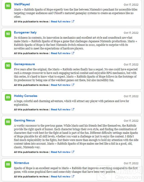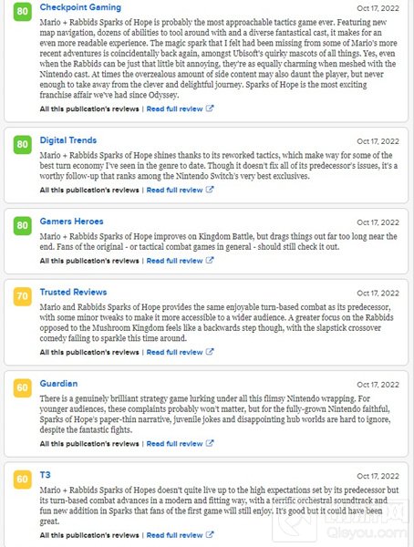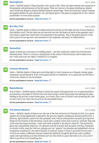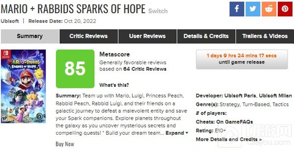 育碧与任天堂合作的《马里奥+疯狂兔子:星耀之愿(MARIO + RABBIDS SPARKS OF HOPE)》将于本周四(10月20日)正式发售,目前游戏媒体评测率先解禁。截止发稿时,游戏在Metacritic共收录64家媒体评测,其中61家好评,3家中评,无差评,均分85。