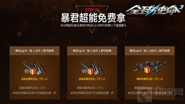 活动期间,购买不同时限的VIP卡即可获得暴君超能武器礼包。玩家充值VIP获得的幸运包只能领取一次,系统也会以邮件的形式发放给对应玩家角色的邮箱。持续拥有VIP卡的qqsmer将更有特权!若玩家同时购买30天、90天、180天的VIP卡,则3种奖励都可以获得。超能、暴君神器拥有着独特的外观造型、特殊的攻击方式和强大的破坏力,更是打倒群雄的神级装备。左牵超能、右擎暴君,加上游戏中特殊的VIP红色标记,做全球最靓的仔!