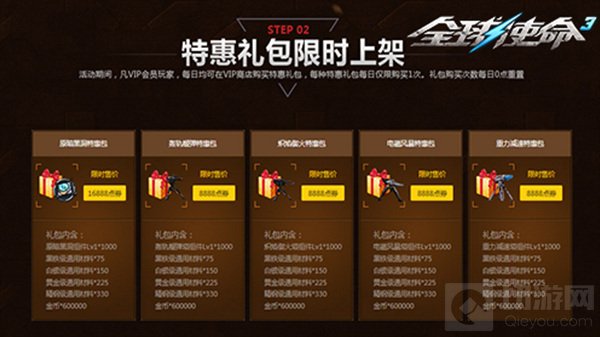 另外,凡VIP会员玩家,每日均可在VIP商店购买特惠礼包。不仅有合成装置塔的重要组件,还有升级武器的必要材料。对于现今火热进行的“无限次元挑战赛”而言,耐抗的火力装置和进攻强悍的武器都是必不可少的要素!另外,VIP玩家还有进入游戏房间防踢和创建私人房间的权限。特惠多多,做真抓实干的行动派吧。