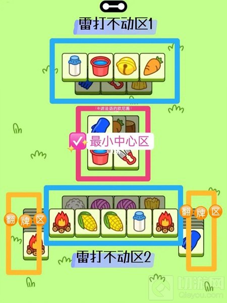前半段(不用道具):中心区内部消除>中心区+翻牌区>中心区+雷打不动区区>雷打不动区+辅助区
