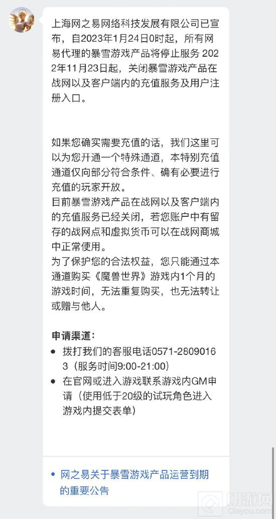 上海网之易网络科技发展有限公司已经宣布,自2023年1月24日0时起,所有网易代理的暴雪游戏产品都会被停止服务,2022年11月23日起,关闭暴雪游戏产品在战网以及客户端内的充值服务及用户注册入口。