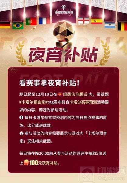 卡塔尔激战正酣,《绿茵信仰》更带来【卡塔尔预言家】晒图预测征集活动。即日起至12月18日,在微博绿茵信仰超话内,带话题#卡塔尔预言家# tag发布符合卡塔尔赛事预测活动要求的内容,即视为参与活动。关注+转发参与欧皇大奖争夺,最高奖金可达11000元!每日还有百元夜宵补贴、神秘口令,送上看球额外福利,不要错过了!
