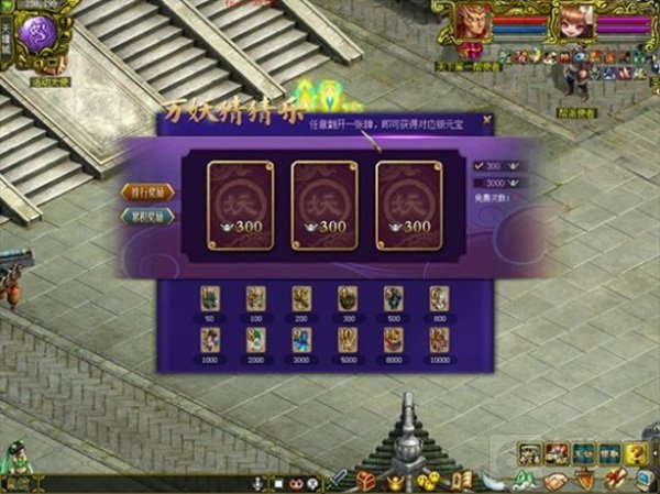 活动期间,在游戏界面内点击右上角“万妖猜猜乐”即可参与活动。打开活动界面后,共有三张牌可选择,翻开任意一张牌就可以获得其对应的银元宝,翻牌后道友可以选择领取当前银元宝或继续翻牌。如选择继续翻牌,再从剩下的两张牌里面选择一张,若再次翻开的牌与第一张牌的奇偶数相同,那么已累积的银元宝将能翻倍!这时道友可再次决定是否继续,若继续可点击下一回合,从出现的两张牌中二选一,选出的牌若和第一张奇偶数相同,则已累积的银元宝再次翻倍!