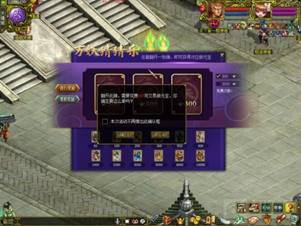 翻牌的牌型共有12种,与之对应能获得的银元宝数也各不相同。获得银元宝的多少,与第一张翻出来的牌型有关。道友可选择300金元宝玩一次或者3000金元宝玩一次。