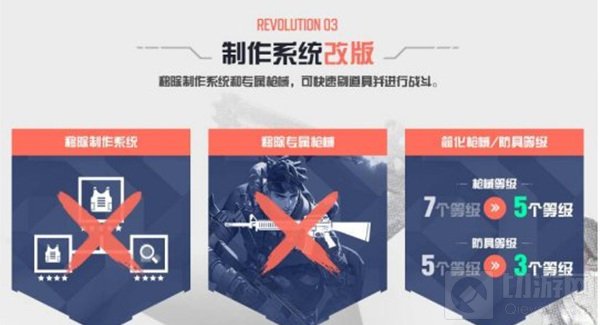 在第三部分“制作系统改版”中可以看到三种改善。分别是,移除制作系统,移除专属枪械,以及简化枪械/防具等级等。其中,枪械等级从7个等级缩减至5个等级,防具也从5个等级缩减至3个等级。