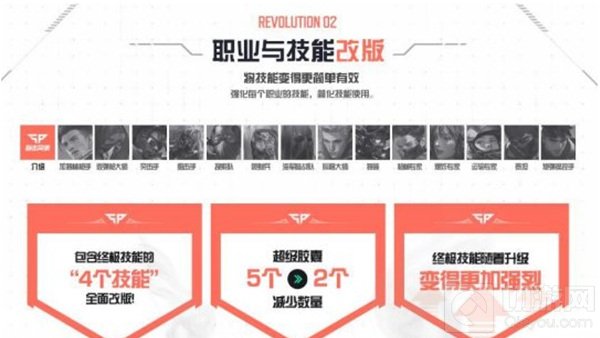 在第二部分“职业与技能改版”中可以看到三种改善。分别是,包括终极技能的“4个技能”全面改版;超级胶囊从5种减少至两种;终极技能随着升级,变得更加强力等。