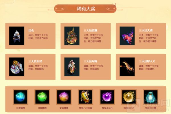 8阶御灵坐骑:巨骨刺,三/二天技玄冥、后土、招财猪等极品宠物,另有神兽精魄、变异精魄、特级归元露、特级点化丹、高级道具套餐卡等超值道具豪礼,龙鳞手镯、幻彩项链、八角晶牌、15级内丹、秘笈、变身卡等稀有道具,各类奖品丰富多样!